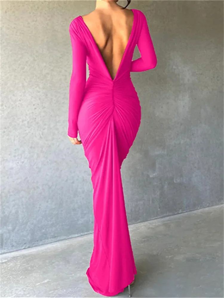 Women Long Bodycon Dress Solid Color Deep V-Neck Ruched Long Sleeve Dress Spring Fall Evening Party Dress