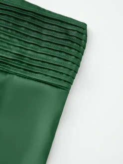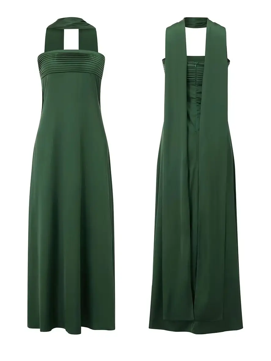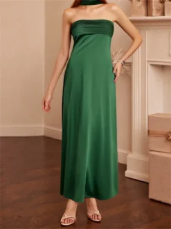 Women’s Long Satin Tube Dress Solid Color Low Cut Strapless Pleated Design Slim Dress
